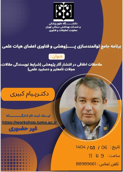 در راستای برنامه جامع توانمندسازی پژوهشی و فناوری اعضای هیات علمی، کارگاه «ملاحظات اخلاقی در انتشار آثار پژوهشی (شرایط نویسندگی مقالات، مجلات نامعتبر و دستبرد علمی)» در تاریخ‌ 6 خرداد ماه 1404 توسط معاونت تحقیقات و فناوری دانشگاه علوم پزشکی تهران به صورت آنلاین برگزار شد.